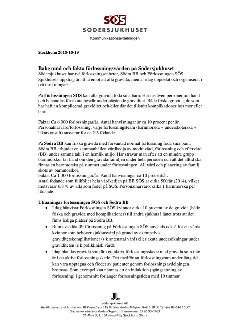 Bakgrund och fakta förlossningsvården på Södersjukhuset