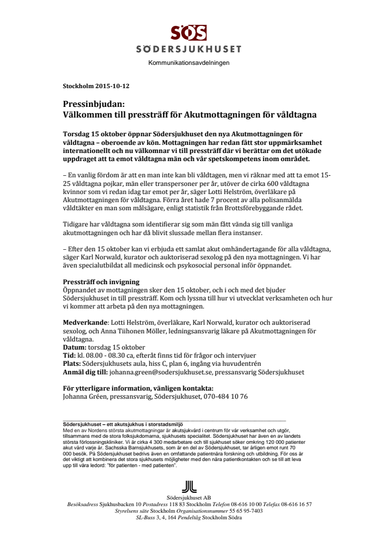 Torsdag 15 oktober öppnar Södersjukhuset den nya Akutmottagningen för våldtagna – oberoende av kön. Mottagningen har redan fått stor uppmärksamhet internationellt och nu välkomnar vi till pressträff där vi berättar om det utökade uppdraget att ta emot våldtagna män och vår spetskompetens inom området.