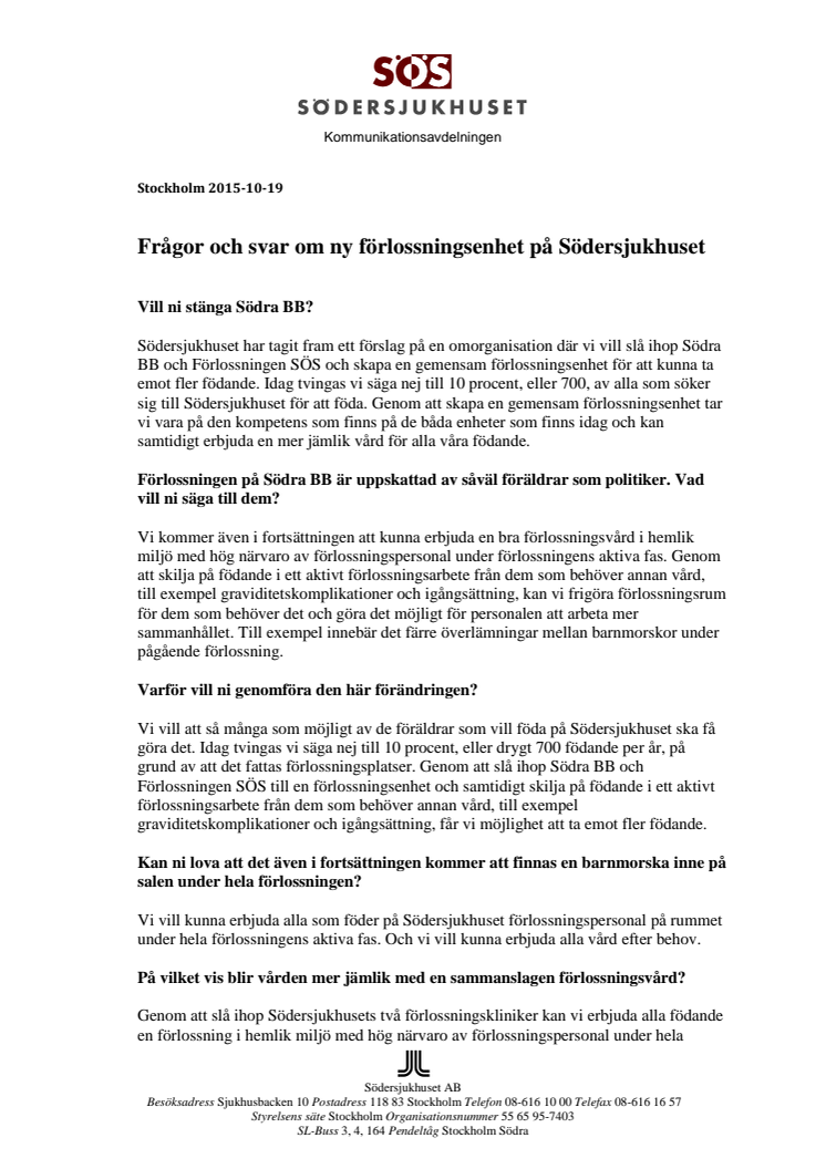 Södersjukhuset har tagit fram ett förslag som går ut på att skapa en sammanhållen förlossningsenhet för att kunna ta emot fler som vill föda barn på sjukhuset och öka närvaron av vårdpersonal på förlossningsrummet. Genom detta förbättras möjligheterna att erbjuda jämlik vård. Idag finns två enheter, Förlossningen SÖS och Södra BB.
