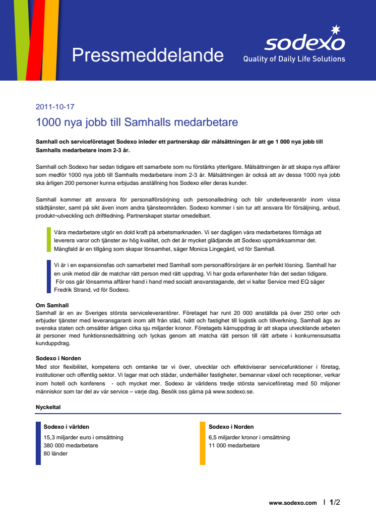 Samhall och serviceföretaget Sodexo inleder ett partnerskap där målsättningen är att ge 1 000 nya jobb till Samhalls medarbetare inom 2-3 år.