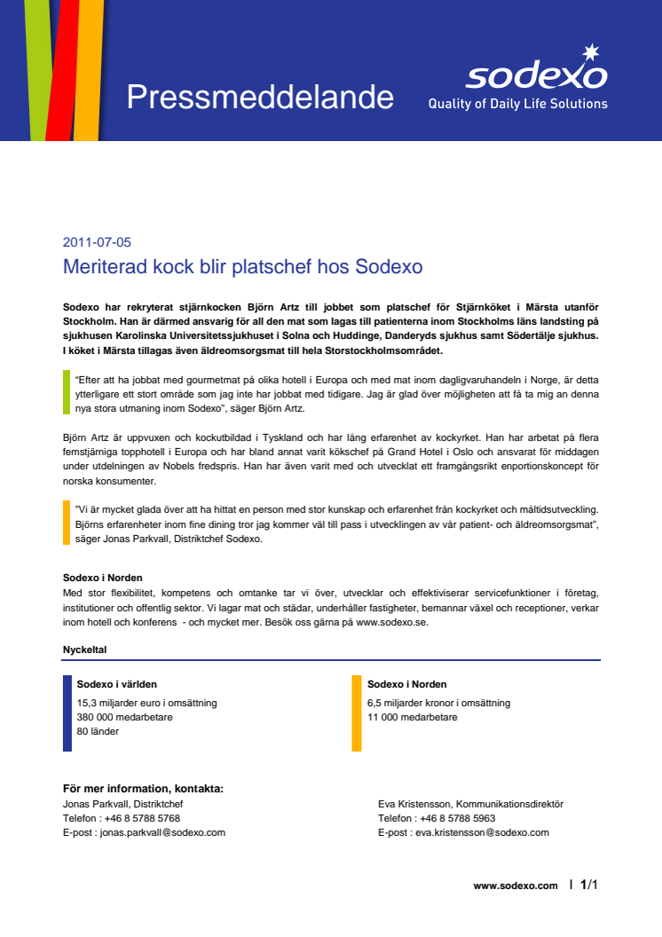 Sodexo har rekryterat stjärnkocken Björn Artz till jobbet som platschef för Stjärnköket i Märsta utanför Stockholm. Han är därmed ansvarig för all den mat som lagas till patienterna inom Stockholms läns landsting på sjukhusen Karolinska Universitetssjukhuset i Solna och Huddinge, Danderyds sjukhus samt Södertälje sjukhus. I köket i Märsta tillagas även äldreomsorgsmat till hela Storstockholmsområd