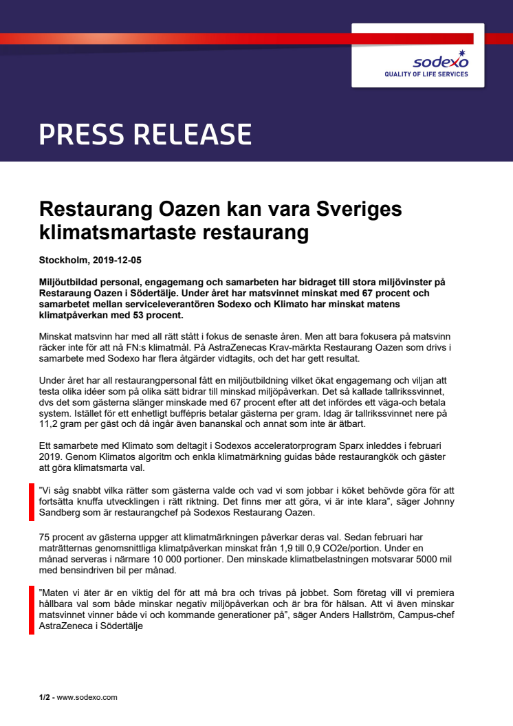 Miljöutbildad personal, engagemang och samarbeten har bidragit till stora miljövinster på Restaurang Oazen i Södertälje. Under året har matsvinnet minskat med 67 procent och samarbetet mellan serviceleverantören Sodexo och Klimato har minskat matens klimatpåverkan med 53 procent.
