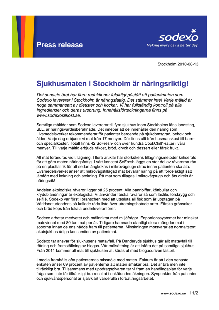 Det senaste året har flera redaktioner felaktigt påstått att patientmaten som Sodexo levererar i Stockholm är näringsfattig. Det stämmer inte! Varje måltid är noga sammansatt av dietister och kockar. Vi har fullständig kontroll på alla ingredienser och deras ursprung. Innehållsförteckningarna finns på www.sodexosllkost.se.