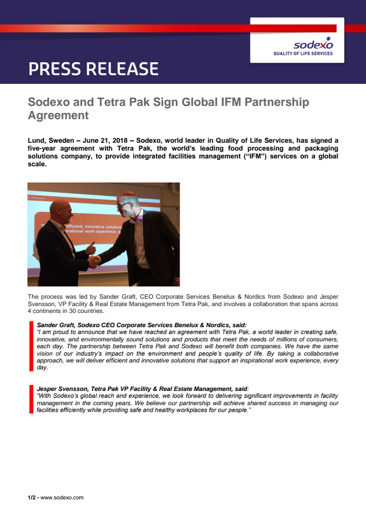 Sodexo, world leader in Quality of Life Services, has signed a five-year agreement with Tetra Pak, the world’s leading food processing and packaging solutions company, to provide integrated facilities management (“IFM”) services on a global scale.