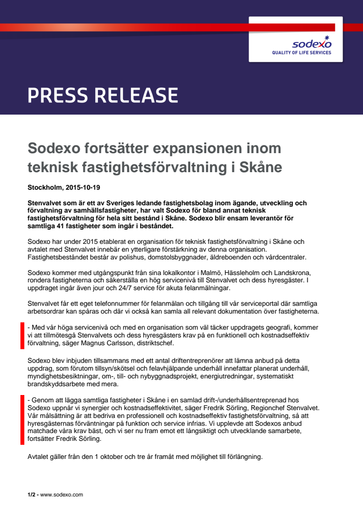 Stenvalvet som är ett av Sveriges ledande fastighetsbolag inom ägande, utveckling och förvaltning av samhällsfastigheter, har valt Sodexo för bland annat teknisk fastighetsförvaltning för hela sitt bestånd i Skåne. Sodexo blir ensam leverantör för samtliga 41 fastigheter som ingår i beståndet.