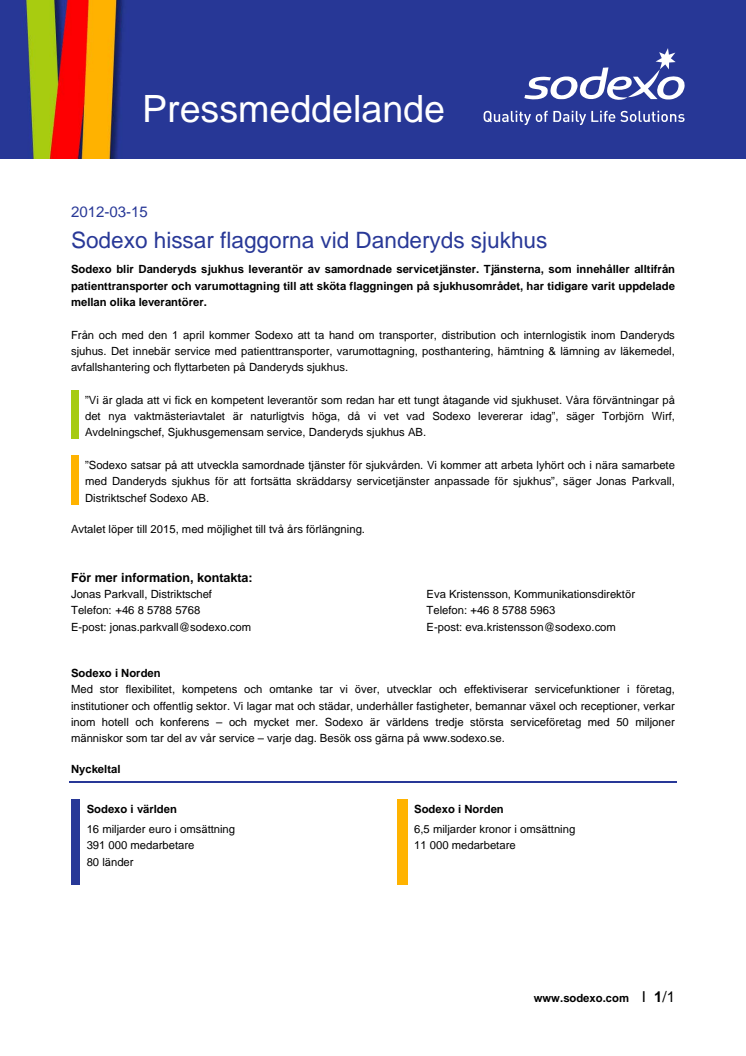 Sodexo blir Danderyds sjukhus leverantör av samordnade servicetjänster. Tjänsterna, som innehåller alltifrån patienttransporter och varumottagning till att sköta flaggningen på sjukhusområdet, har tidigare varit uppdelade mellan olika leverantörer.