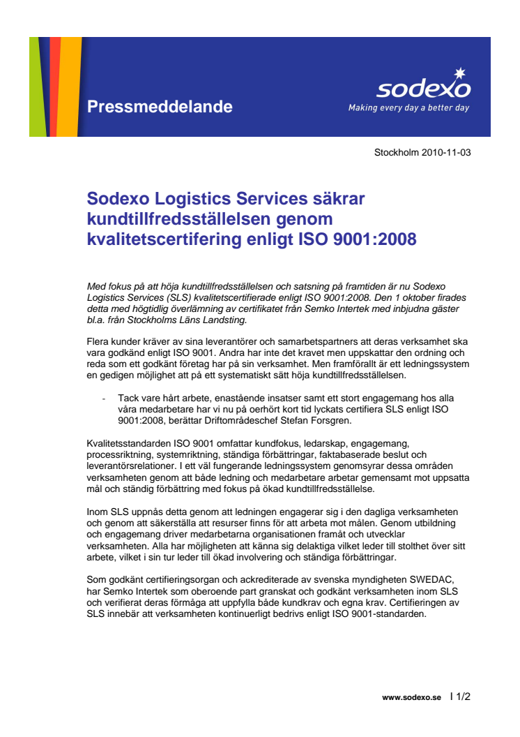 Med fokus på att höja kundtillfredsställelsen och satsning på framtiden är nu Sodexo Logistics Services (SLS) kvalitetscertifierade enligt ISO 9001:2008. Den 1 oktober firades detta med högtidlig överlämning av certifikatet från Semko Intertek med inbjudna gäster bl.a. från Stockholms Läns Landsting.