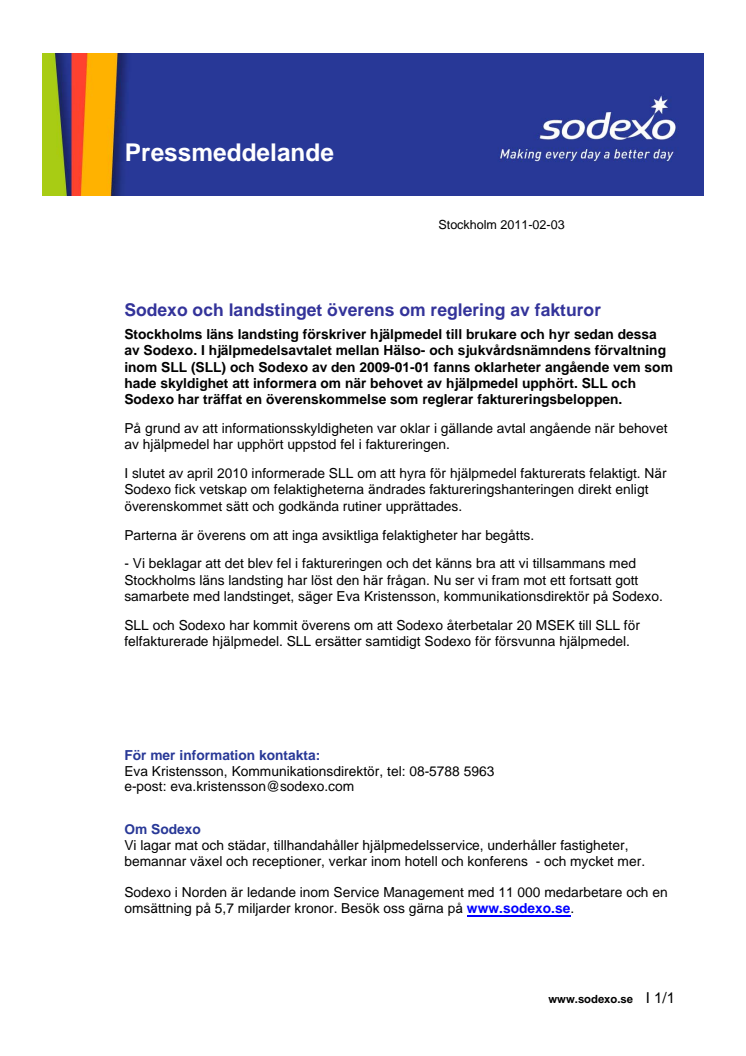 Stockholms läns landsting förskriver hjälpmedel till brukare och hyr sedan dessa av Sodexo. I hjälpmedelsavtalet mellan Hälso- och sjukvårdsnämndens förvaltning inom SLL (SLL) och Sodexo av den 2009-01-01 fanns oklarheter angående vem som hade skyldighet att informera om när behovet av hjälpmedel upphört. SLL och Sodexo har träffat en överenskommelse som reglerar faktureringsbeloppen.