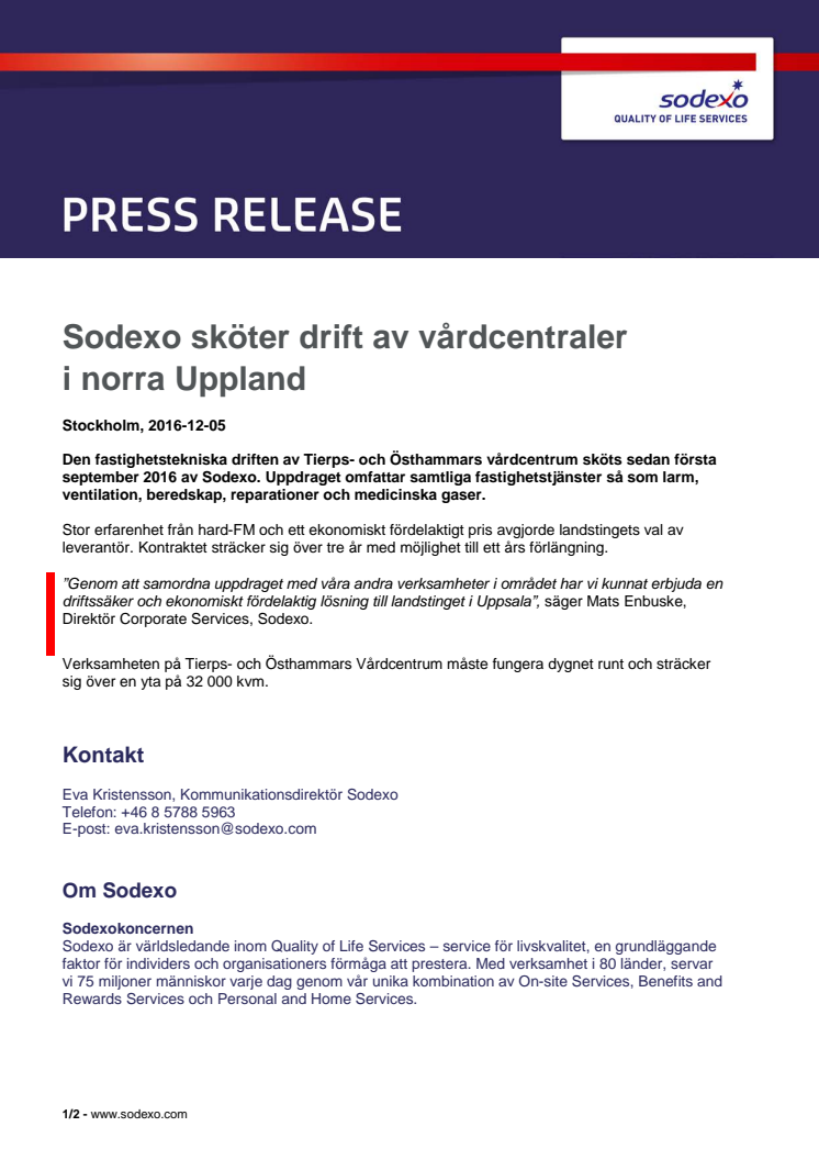Den fastighetstekniska driften av Tierps- och Östhammars vårdcentrum sköts sedan första september 2016 av Sodexo. Uppdraget omfattar samtliga fastighetstjänster så som larm, ventilation, beredskap, reparationer och medicinska gaser.