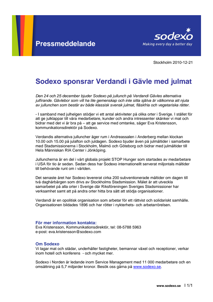 Den 24 och 25 december bjuder Sodexo på jullunch på Verdandi Gävles alternativa julfirande. Gävlebor som vill ha lite gemenskap och inte sitta själva är välkomna att njuta av jullunchen som består av både klassisk svensk julmat, fläskfria och vegetariska rätter.