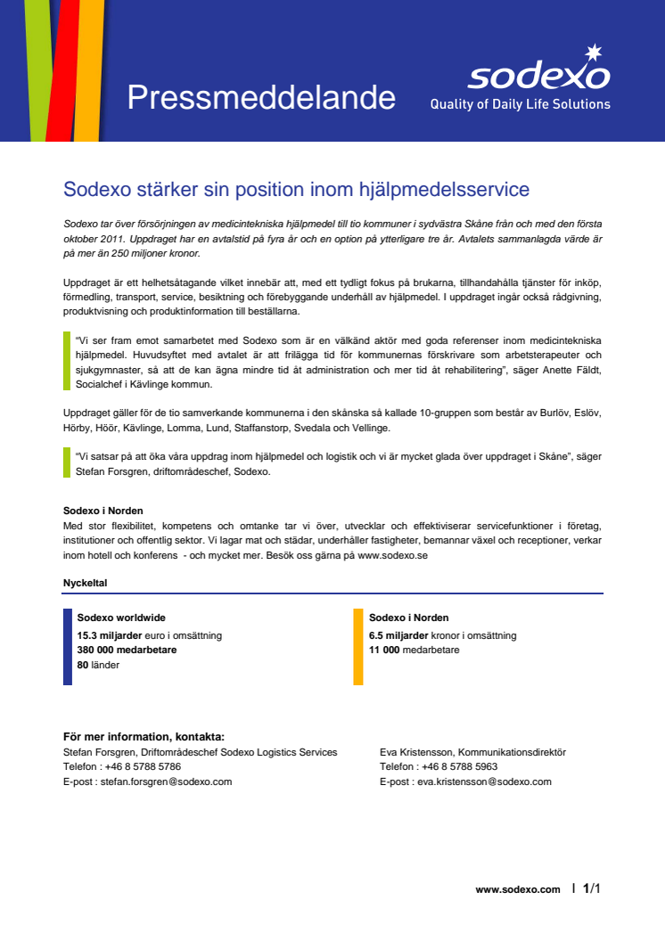 Sodexo tar över försörjningen av medicintekniska hjälpmedel till tio kommuner i sydvästra Skåne från och med den första oktober 2011. Uppdraget har en avtalstid på fyra år och en option på ytterligare tre år. Avtalets sammanlagda värde är på mer än 250 miljoner kronor.