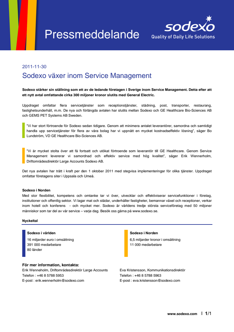 Sodexo stärker sin ställning som ett av de ledande företagen i Sverige inom Service Management. Detta efter att ett nytt avtal omfattande cirka 300 miljoner kronor slutits med General Electric.