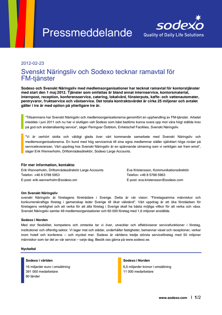 Sodexo och Svenskt Näringsliv med medlemsorganisationer har tecknat ramavtal för kontorstjänster med start den 1 maj 2012. Tjänster som omfattas är bland annat internservice, lokalvård, reception, kontorsmaterial, internpost, konferensservice, catering, fönsterputs, kaffe- och vattenautomater, pentryvaror, fruktservice och växtservice