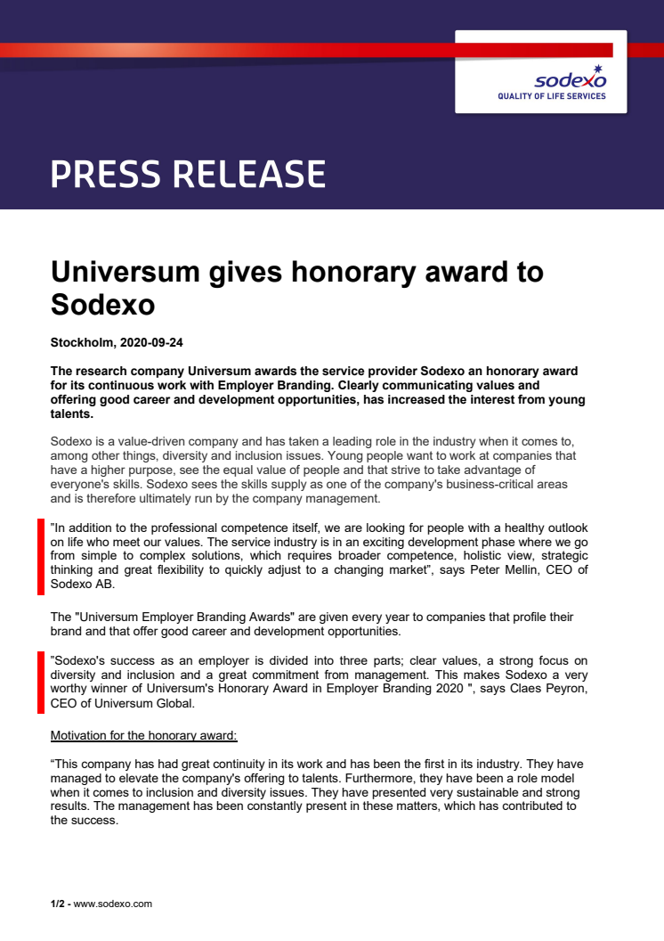 The research company Universum awards the service provider Sodexo an honorary award for its continuous work with Employer Branding. Clearly communicating values and offering good career and development opportunities, has increased the interest from young talents.