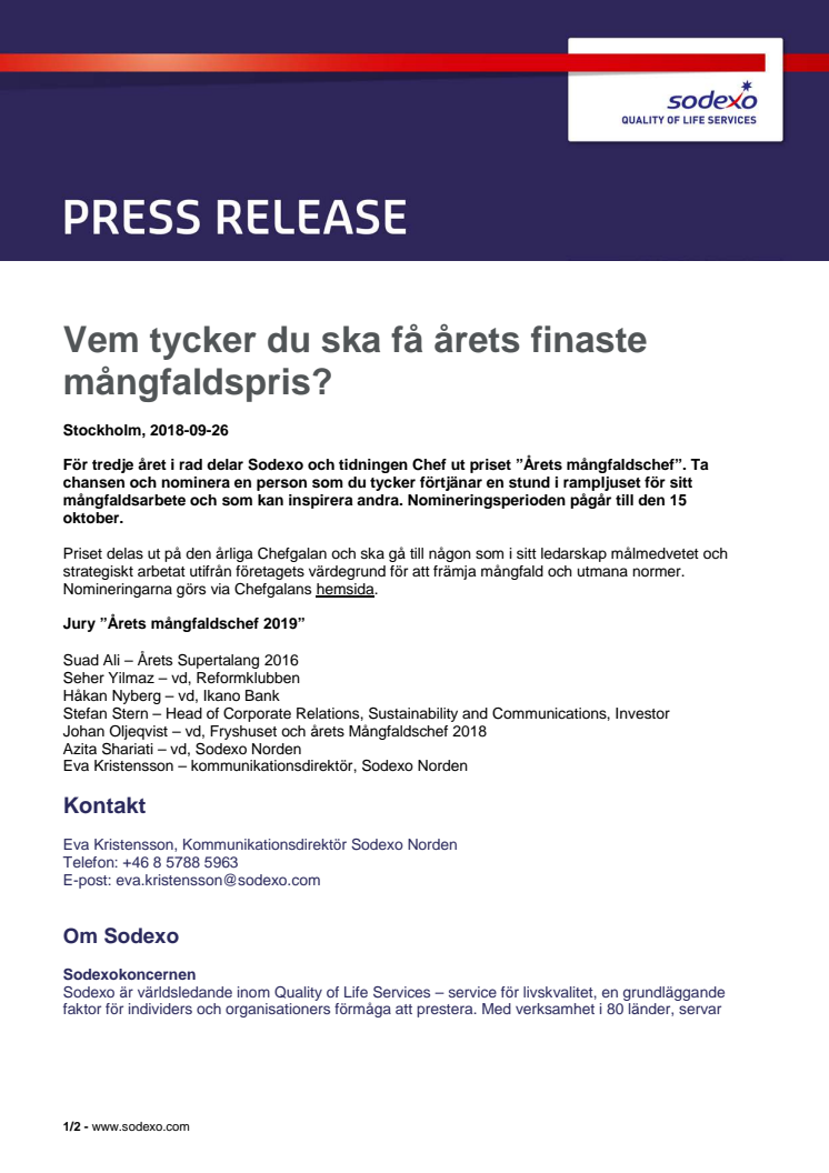 För tredje året i rad delar Sodexo och tidningen Chef ut priset ”Årets mångfaldschef”. Ta chansen och nominera en person som du tycker förtjänar en stund i rampljuset för sitt mångfaldsarbete och som kan inspirera andra. Nomineringsperioden pågår till den 15 oktober.