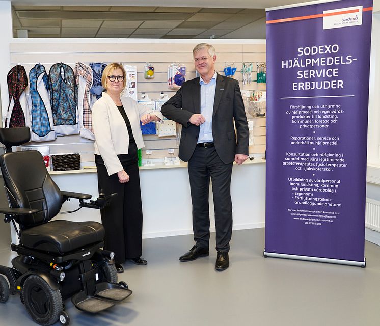 Armbågshälsning Bengt Thorsson, vd Permobil, och Lena Jansson, Distriktschef Sodexo