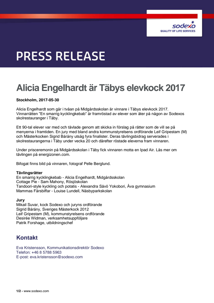 Alicia Engelhardt som går i tvåan på Midgårdsskolan är vinnare i Täbys elevkock 2017.Vinnarrätten ”En smarrig kycklingkebab” är framröstad av elever som äter på någon av Sodexos skolrestauranger i Täby.
