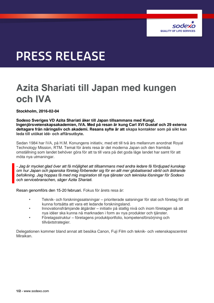 Sodexo Sveriges VD Azita Shariati åker till Japan tillsammans med Kungl. Ingenjörsvetenskapsakademien, IVA. Med på resan är kung Carl XVI Gustaf och 29 externa deltagare från näringsliv och akademi. Resans syfte är att skapa kontakter som på sikt kan leda till utökat idé- och affärsutbyte.