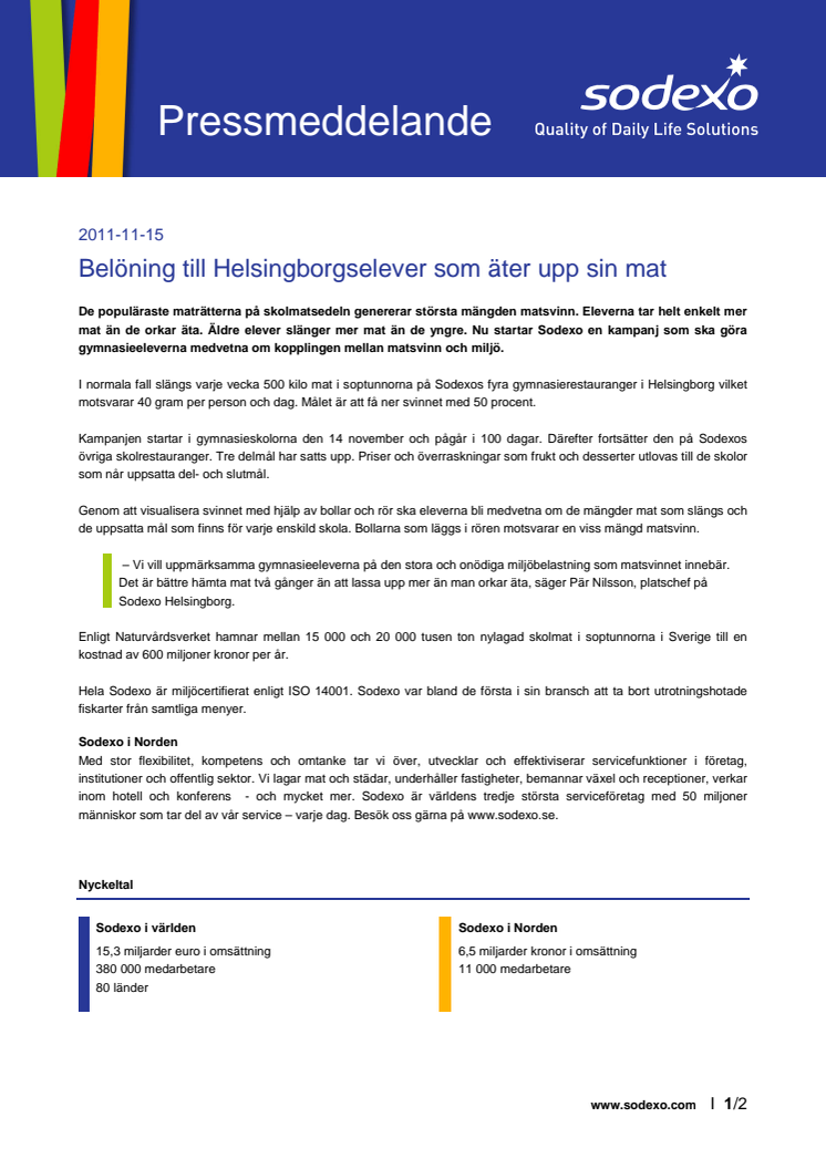 Sodexo i Norden är ledande inom Service Management med 11 000 medarbetare och en omsättning på 6,5 miljarder kronor.