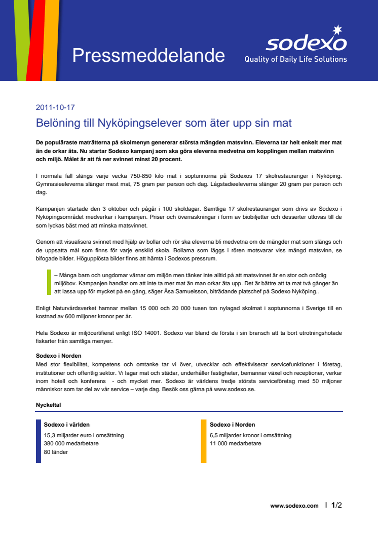 Sodexo i Norden är ledande inom Service Management med 11 000 medarbetare och en omsättning på 6,5 miljarder kronor.