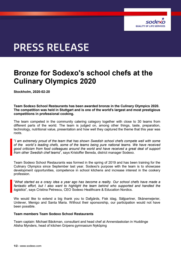 Team Sodexo School Restaurants har tilldelats brons i Culinary Olympics 2020. Tävlingen genomfördes i Stuttgart och är en av världens största och mest prestigefyllda tävlingar inom professionell matlagning.