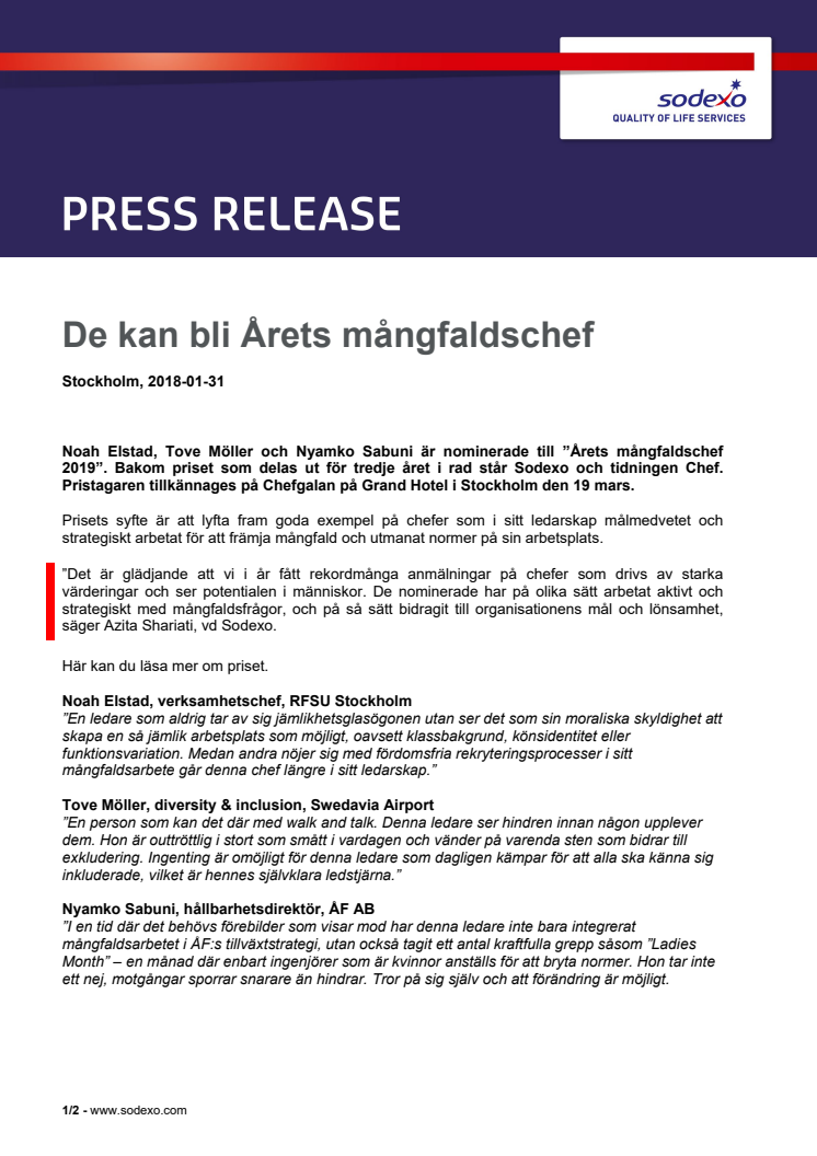 ”Det är glädjande att vi i år fått rekordmånga anmälningar på chefer som drivs av starka värderingar och ser potentialen i människor. De nominerade har på olika sätt arbetat aktivt och strategiskt med mångfaldsfrågor, och på så sätt bidragit till organisationens mål och lönsamhet,säger Azita Shariati, vd Sodexo.