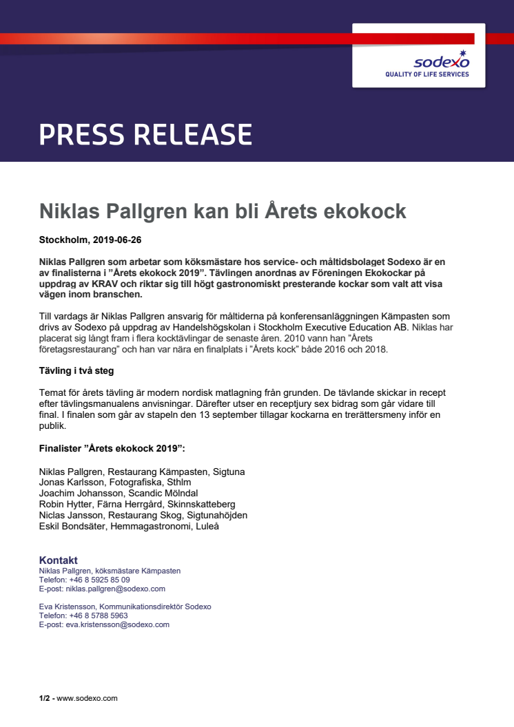 Niklas Pallgren som arbetar som köksmästare hos service- och måltidsbolaget Sodexo är en av finalisterna i ”Årets ekokock 2019”. Tävlingen anordnas av Föreningen Ekokockar på uppdrag av KRAV och riktar sig till högt gastronomiskt presterande kockar som valt att visa vägen inom branschen.
