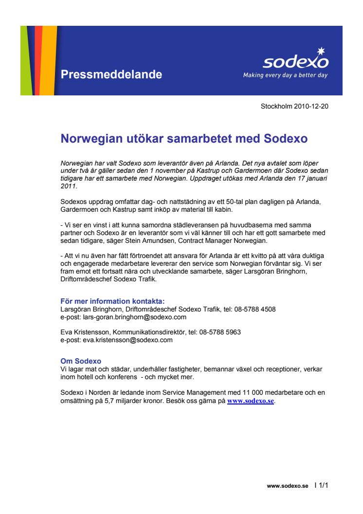 - Att vi nu även har fått förtroendet att ansvara för Arlanda är ett kvitto på att våra duktiga och engagerade medarbetare levererar den service som Norwegian förväntar sig. Vi ser fram emot ett fortsatt och nära och utvecklande samarbete med Norwegian, säger Larsgöran Bringhorn, Driftområdeschef Sodexo Trafik.