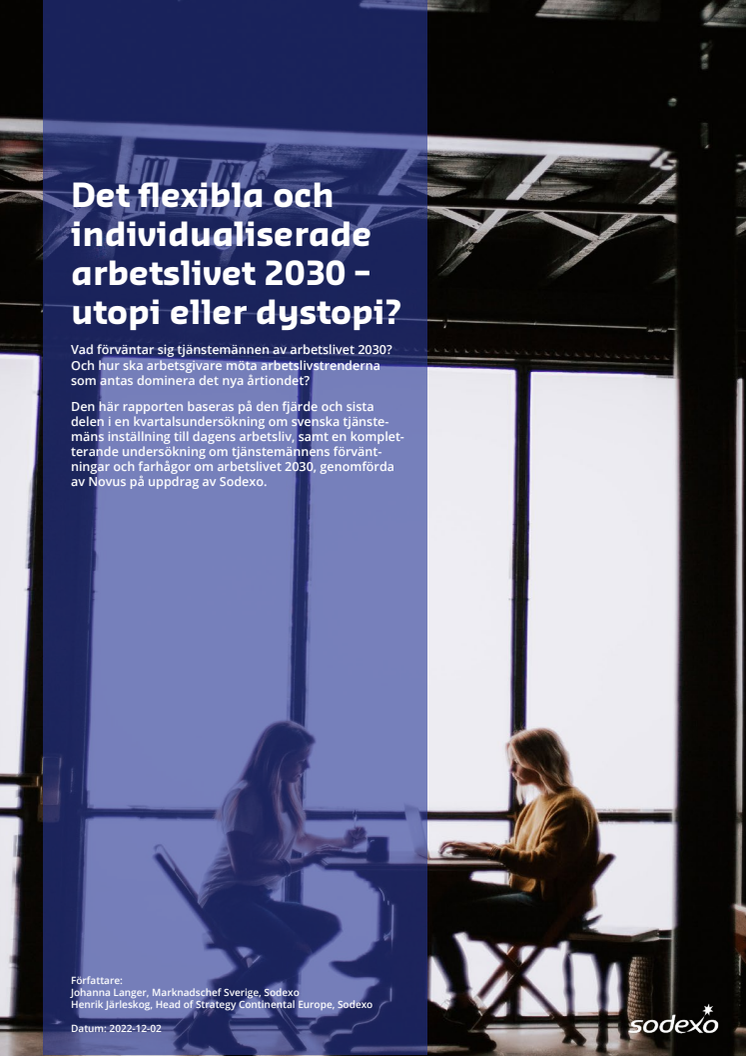 I samarbete med Novus har Sodexo sedan hösten 2021 genomfört kvartalsvisa undersökningar för att mäta svenska tjänstemäns inställning till arbetslivet. Den fjärde och sista undersökningen genomfördes i oktober 2022, och har resulterat i rapporten Det flexibla och individualiserade arbetslivet 2030 – utopi eller dystopi? som nu lanseras. I undersökningen har Novus intervjuat drygt 1 000 svenska tjänstemän om deras nuvarande arbetssituation, samt hur de tror och hoppas att arbetslivet ser ut 2030.