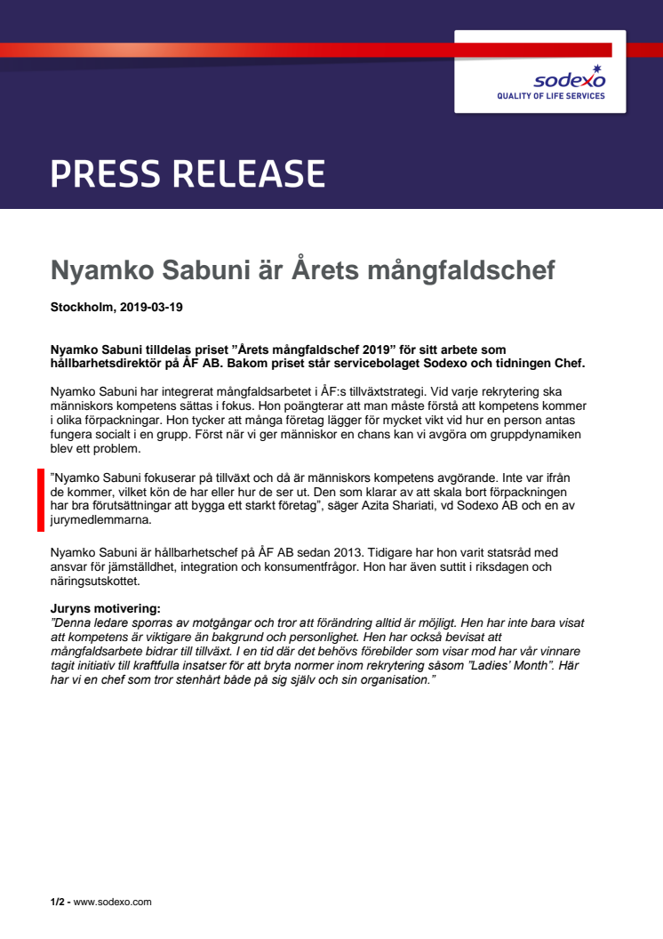 Nyamko Sabuni tilldelas priset ”Årets mångfaldschef 2019” för sitt arbete som hållbarhetsdirektör på ÅF AB. Bakom priset står servicebolaget Sodexo och tidningen Chef.