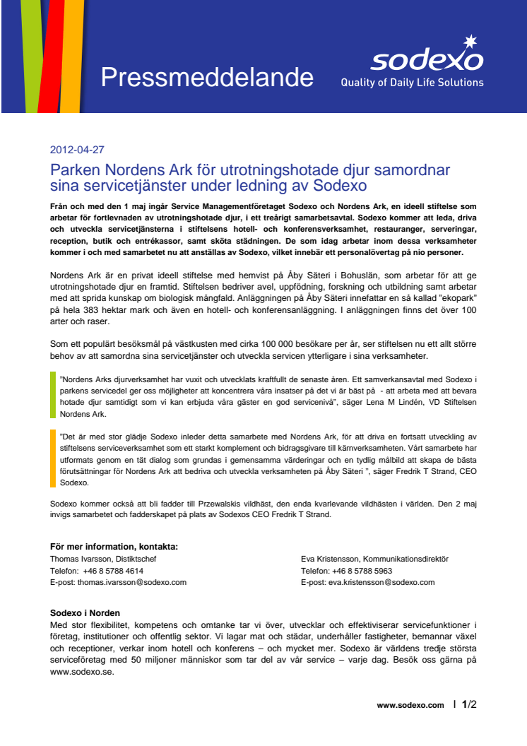Från och med den 1 maj ingår Service Managementföretaget Sodexo och Nordens Ark, en ideell stiftelse som arbetar för fortlevnaden av utrotningshotade djur, i ett treårigt samarbetsavtal. Sodexo kommer att leda, driva och utveckla servicetjänsterna i stiftelsens hotell- och konferensverksamhet, restauranger, serveringar, reception, butik och entrékassor, samt sköta städningen. De som idag arbetar inom dessa verksamheter kommer i och med samarbetet nu att anställas av Sodexo, vilket innebär ett personalövertag på nio personer.