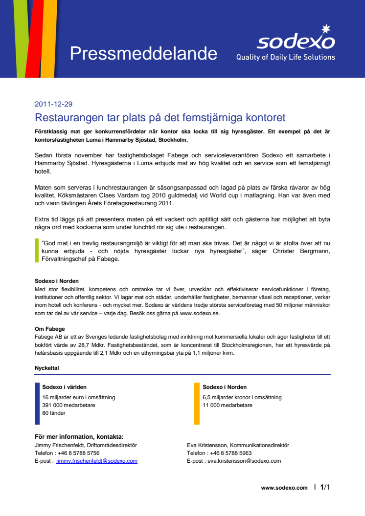 Sodexo i Norden är ledande inom Service Management med 11 000 medarbetare och en omsättning på 6,5 miljarder kronor.