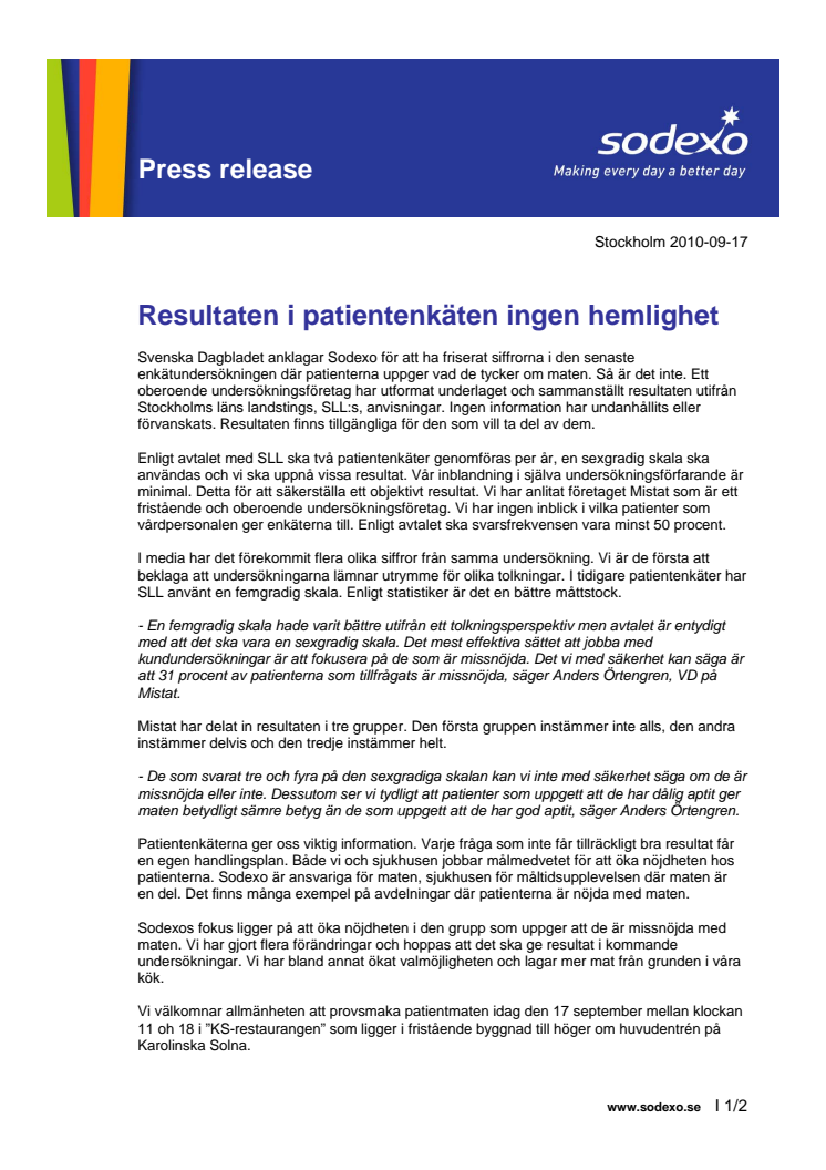 Svenska Dagbladet anklagar Sodexo för att ha friserat siffrorna i den senaste enkätundersökningen där patienterna uppger vad de tycker om maten. Så är det inte. Ett oberoende undersökningsföretag har utformat underlaget och sammanställt resultaten utifrån Stockholms läns landstings, SLL:s, anvisningar. Ingen information har undanhållits eller förvanskats. Resultaten finns tillgängliga för den som vill ta del av dem.