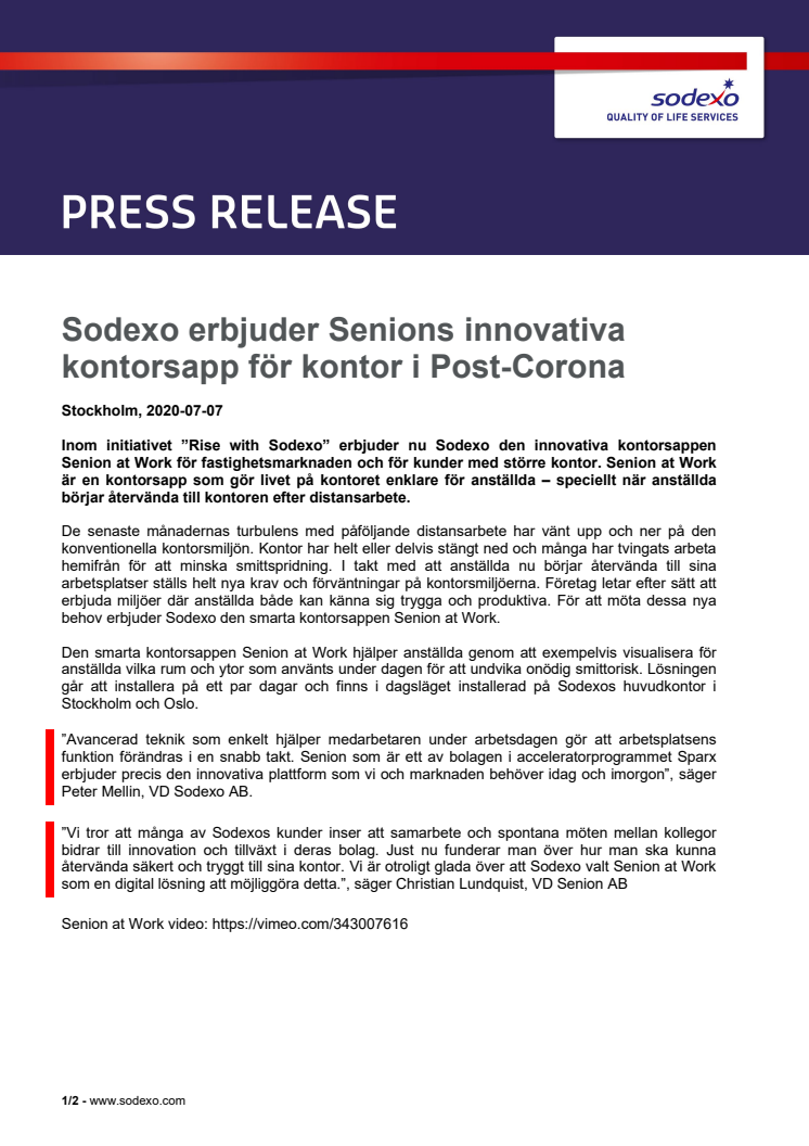 ”Vi tror att många av Sodexos kunder inser att samarbete och spontana möten mellan kollegor bidrar till innovation och tillväxt i deras bolag. Just nu funderar man över hur man ska kunna återvända säkert och tryggt till sina kontor. Vi är otroligt glada över att Sodexo valt Senion at Work som en digital lösning att möjliggöra detta.”, säger Christian Lundquist, VD Senion AB