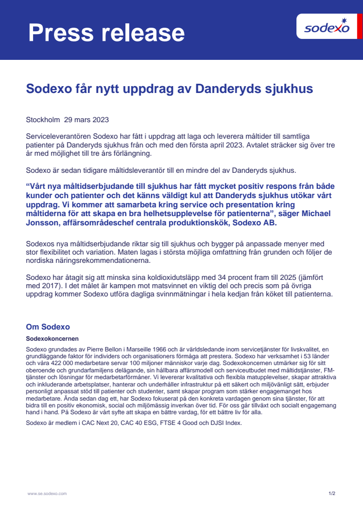 -Vårt måltidserbjudande till sjukhus har fått mycket positiv respons från både kunder och patienter och det känns väldigt kul att Danderyds sjukhus utökar vårt uppdrag. Vi kommer att samarbeta kring service och presentation kring måltiderna för att skapa en bra helhetsupplevelse för patienterna, säger Michael Jonsson, affärsområdeschef centrala produktionskök, Sodexo AB.
