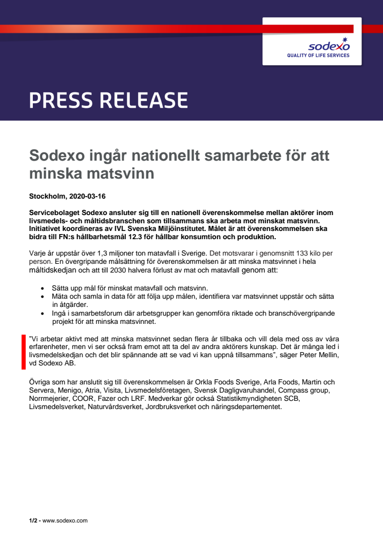Servicebolaget Sodexo ansluter sig till en nationell överenskommelse mellan aktörer inom livsmedels- och måltidsbranschen som tillsammans ska arbeta mot minskat matsvinn. Initiativet koordineras av IVL Svenska Miljöinstitutet. Målet är att överenskommelsen ska bidra till FN:s hållbarhetsmål 12.3 för hållbar konsumtion och produktion.