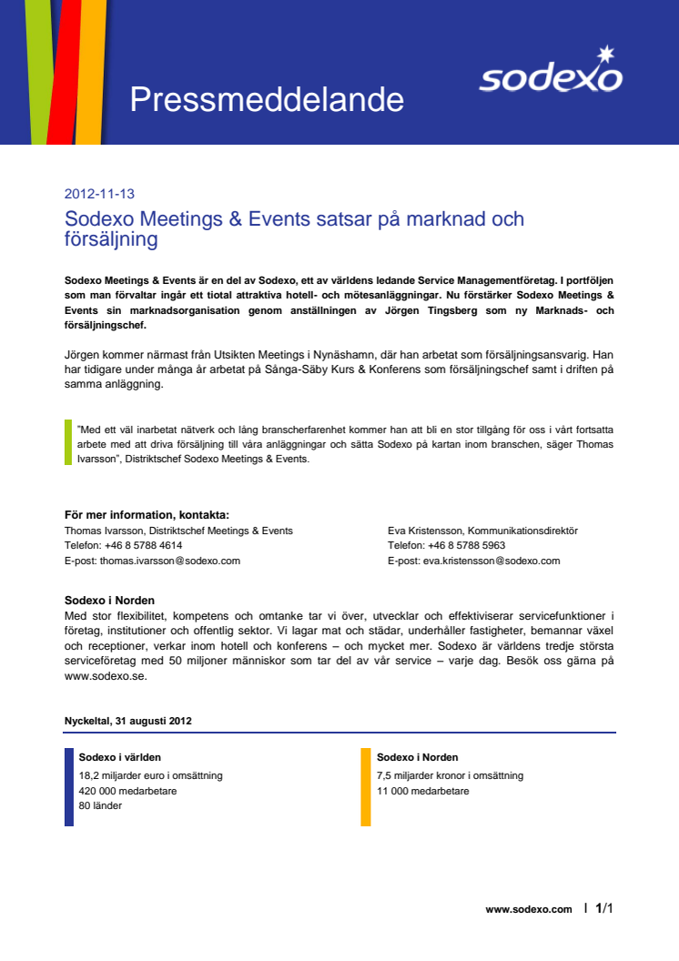 Sodexo Meetings & Events är en del av Sodexo, ett av världens ledande Service Managementföretag. I portföljen som man förvaltar ingår ett tiotal attraktiva hotell- och mötesanläggningar. Nu förstärker Sodexo Meetings & Events sin marknadsorganisation genom anställningen av Jörgen Tingsberg som ny Marknads- och försäljningschef.