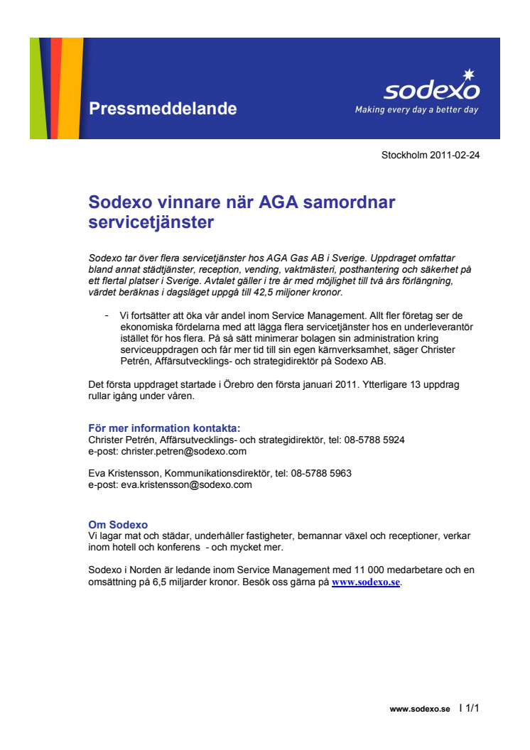 Sodexo tar över flera servicetjänster hos AGA Gas AB i Sverige. Uppdraget omfattar bland annat städtjänster, reception, vending, vaktmästeri, posthantering och säkerhet på ett flertal platser i Sverige. Avtalet gäller i tre år med möjlighet till två års förlängning, värdet beräknas i dagsläget uppgå till 42,5 miljoner kronor.