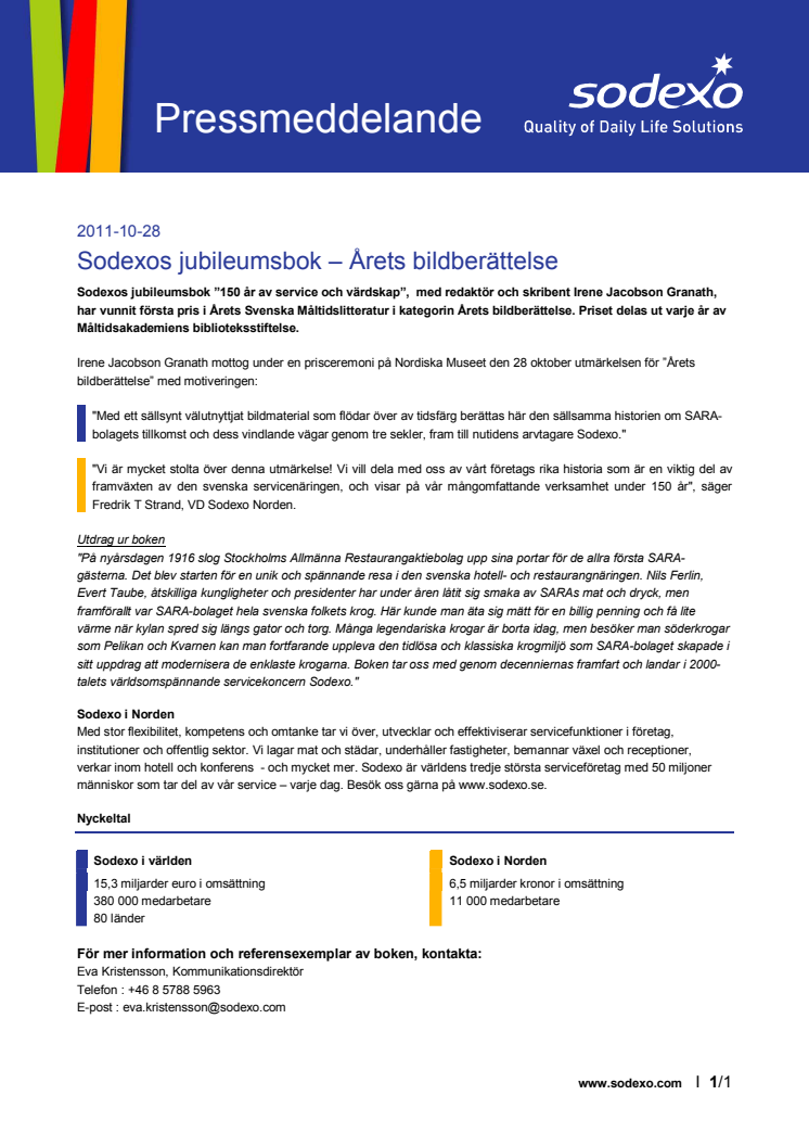 Sodexos jubileumsbok ”150 år av service och värdskap”, med redaktör och skribent Irene Jacobson Granath, har vunnit första pris i Årets Svenska Måltidslitteratur i kategorin Årets bildberättelse. Priset delas ut varje år av Måltidsakademiens biblioteksstiftelse.