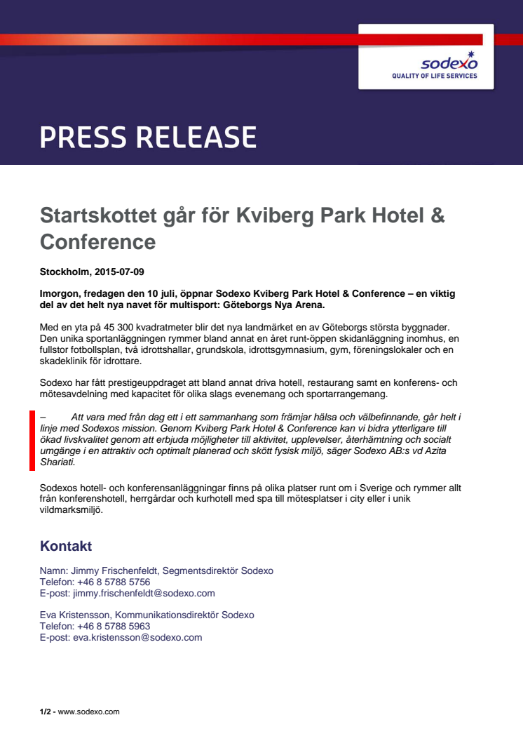– Att vara med från dag ett i ett sammanhang som främjar hälsa och välbefinnande, går helt i linje med Sodexos mission. Genom Kviberg Park Hotel & Conference kan vi bidra ytterligare till ökad livskvalitet genom att erbjuda möjligheter till aktivitet, upplevelser, återhämtning och socialt umgänge i en attraktiv och optimalt planerad och skött fysisk miljö, säger Sodexo AB:s vd Azita Shariati.