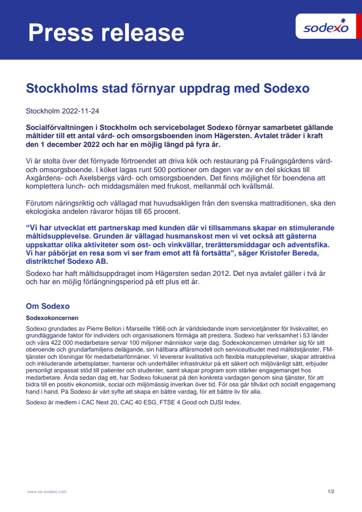 Socialförvaltningen i Stockholm och servicebolaget Sodexo förnyar samarbetet gällande måltider till ett antal vård- och omsorgsboenden inom Hägersten. Avtalet träder i kraft den 1 december 2022 och har en möjlig längd på fyra år.