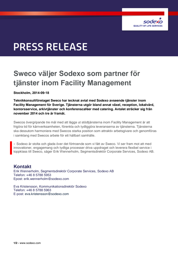 Teknikkonsultföretaget Sweco har tecknat avtal med Sodexo avseende tjänster inom Facility Management för Sverige. Tjänsterna utgör bland annat växel, reception, lokalvård, kontorsservice, arkivtjänster och konferenscaféer med catering. Avtalet sträcker sig från november 2014 och tre år framåt.