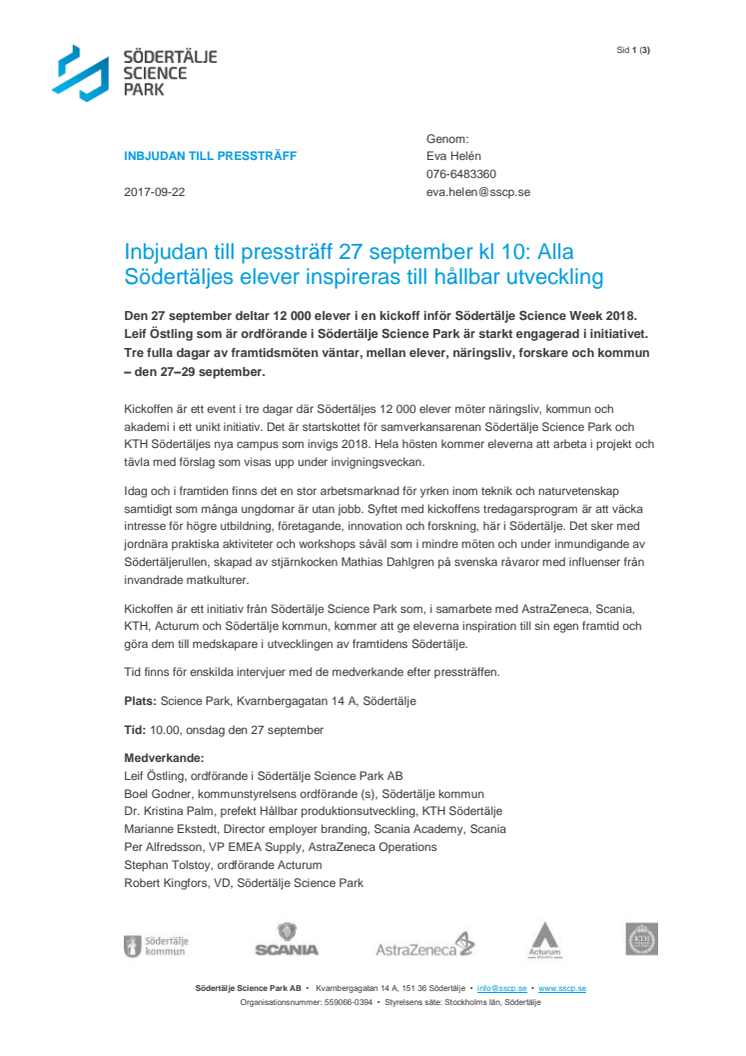• Inbjudan till pressträff 27 september kl 10.00: Alla Södertäljes elever inspireras till hållbar utveckling