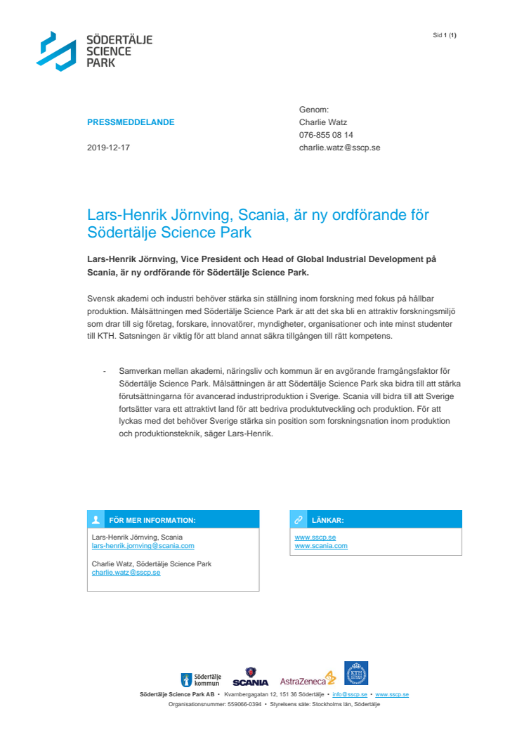 • Lars-Henrik Jörnving, Scania, är ny ordförande för Södertälje Science Park