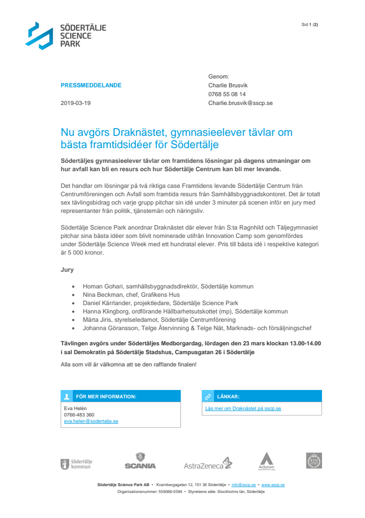 • Draknästet, gymnasieelever tävlar om bästa framtidsidéer för Södertälje