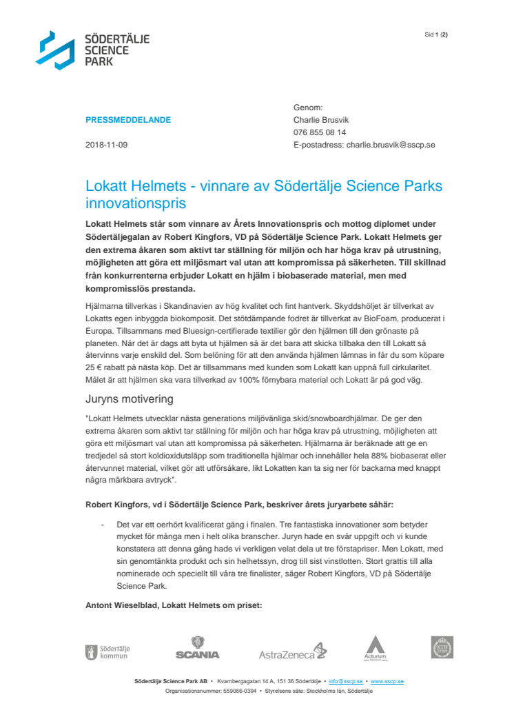 Lokatt Helmets stod som vinnare av Årets Innovationspris 2018 och mottog diplomet under Södertäljegalan av Robert Kingfors, VD på Södertälje Science Park.