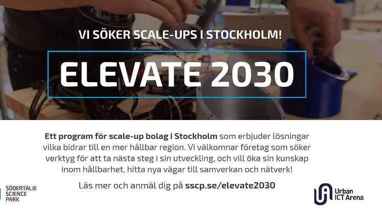 Elevate 2030 är ett program för scale-up bolag i Stockholm som genom innovativa lösningar bidrar till en mer hållbar region. Vi välkomnar företag som söker verktyg för att ta nästa steg i sin utveckling, och vill öka sin kunskap inom hållbarhet, hitta nya vägar till samverkan och nätverk!