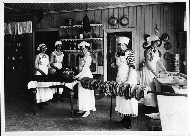 Under 80 år fick unga flickor sin utbildning på Benninge, bland annat i hem och hushåll. Där ingick även matlagning, här bakas hårt bröd. Brödet ska sen fästas uppe vid taket, dels för att torka ordentligt dels för att skyddas från möss och råttor. (SLM P07-2498).
