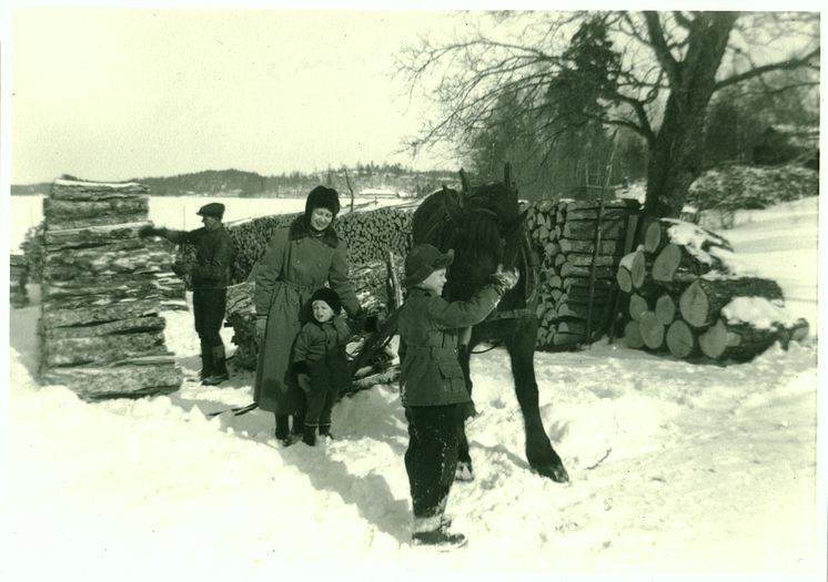 Utställning. Sörmlands museum, Nyköping. Det var kalla vintrar i början av 1940-talet, det gick åt mycket ved för att värma upp hemmen. Familjen Lybeck har staplat ett vedlager vid Stensättra gård i Strängnäs 1942.