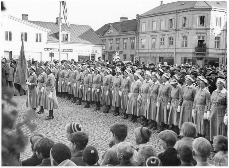 Utställning. Sörmlands museum, Nyköping. Frivilliga i Lottakåren håller parad på Stora torget i Nyköping 1940. Samma år invaderades Danmark och Norge av Nazityskland. Kriget kändes skrämmande nära och allt fler engagerade sig som frivilliga.